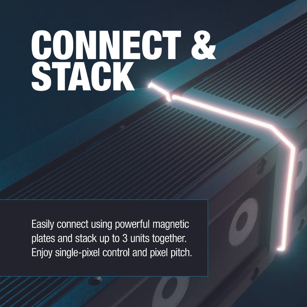 Physically, through the PIXBAR G2’s new connection system that allows multiple bars to be seamlessly combined in vertical or horizontal configurations.